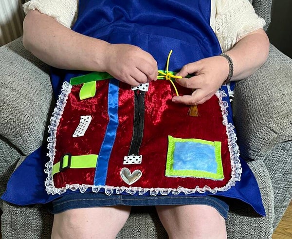 Light weight tactile tabard covered in features to keep hands busy. One Size, Machine Washable 30C. Hang to air dry.